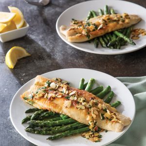 - Wipe skillet clean; reduce heat to medium. Add butter and almonds; cook, stirring frequently, until almonds are toasted and butter solids turn a medium-brown color and have a nutty aroma, 7 to 12 minutes. Add parsley, thyme, lemon juice, and remaining ½ teaspoon salt. Remove from heat; discard thyme. Spoon sauce over fish. Serve immediately with Garlic-Thyme Asparagus and lemon wedges.