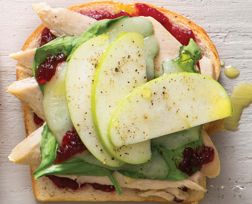 - On one slice of bread, layer 11⁄2 tablespoons cranberry sauce, sliced turkey, 1⁄3 cup baby spinach, sliced white Cheddar cheese, and sliced Granny Smith apple as desired. Bake at 350° until cheese melts, about 10 minutes. Drizzle with olive oil, if desired.