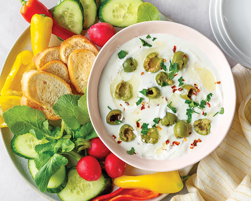 - In the work bowl of a food processor, pulse feta until crumbled. Add yogurt and lemon zest; process until smooth. Transfer feta mixture to a serving bowl. Top with olives. Serve with French bread and vegetables. Garnish with oil, parsley, and crushed red pepper, if desired.