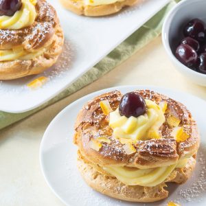 - Cut pastries in half. Fill a pastry bag fitted with a medium open star tip with Orange Pastry Cream. Place piping tip into hole and apply gentle pressure to fill. Repeat with remaining pastries. Top with pastry halves, and pipe cream into hole. Garnish with cherries, orange peel, and confectioners’ sugar, if desired. Serve immediately, or refrigerate until ready to serve. Best served same day.